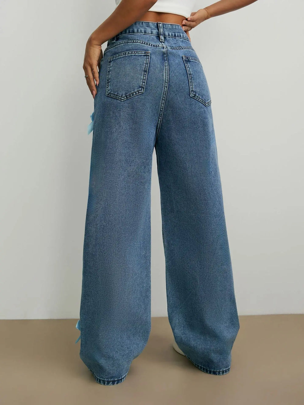 High Waist Bow Washed Distressed Wide Leg Denim Jeans