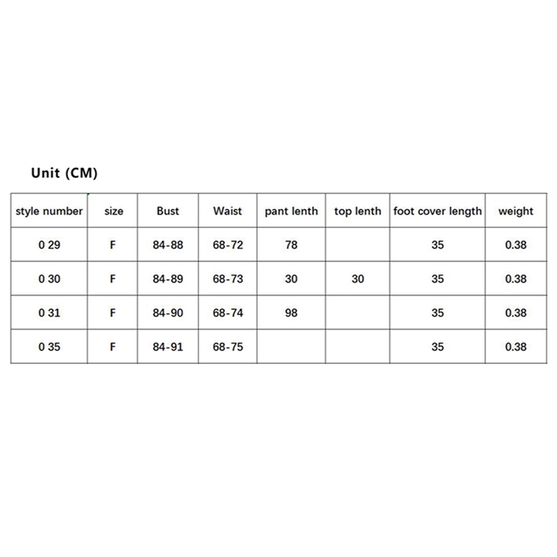 Tops Length: 30 Bust: 84-89 Foot Cover Length: 35 Waist: 68-73 Skirts Length: 30