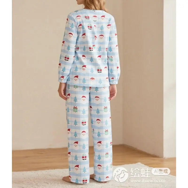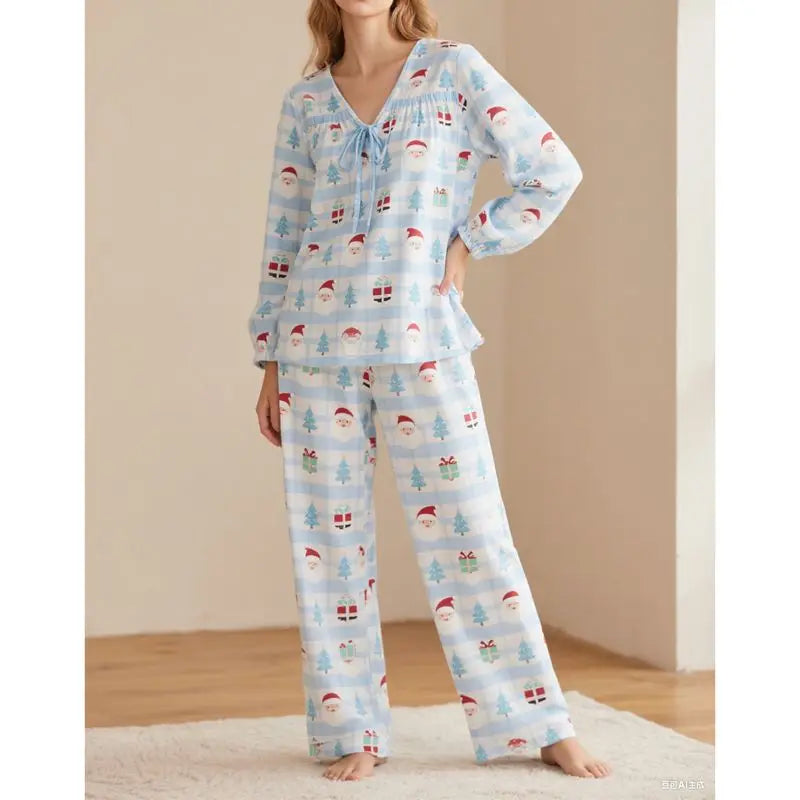 Women's Christmas Pajama Set Long Sleeve Lapel Button Up Santa Claus Tree Print Shirt and Pants Two Piece Lounge Set Lightweight Soft Polyester Night Wear Outfits for Women